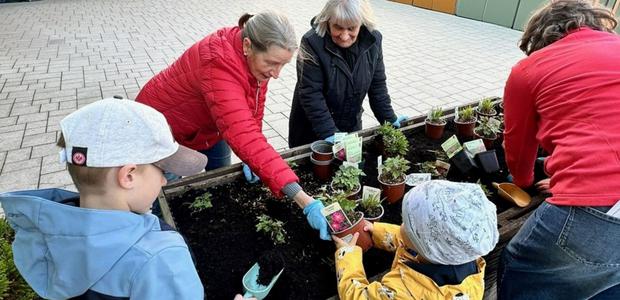 Jung und Alt pflanzen im Hufeland-Haus gemeinsam Blumen